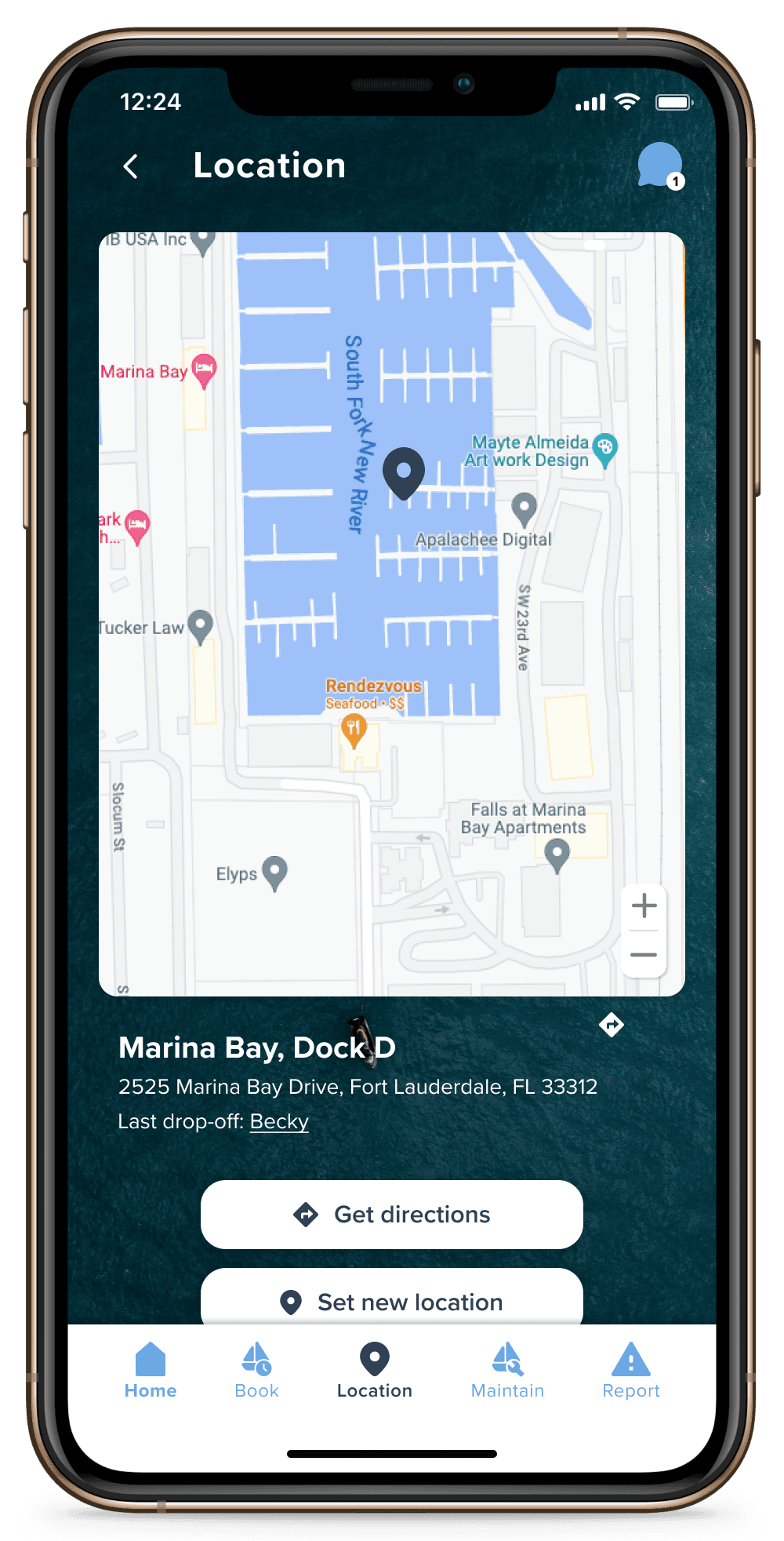 Users can quickly see where the boat is docked or set a new docking location. For convenience, the "Get directions" button links directly to Google Maps, offering directions to the docking spot.
