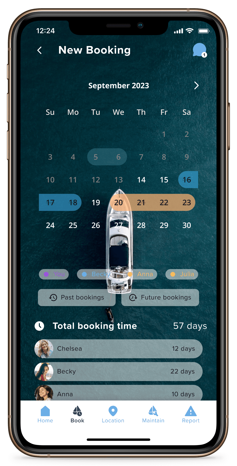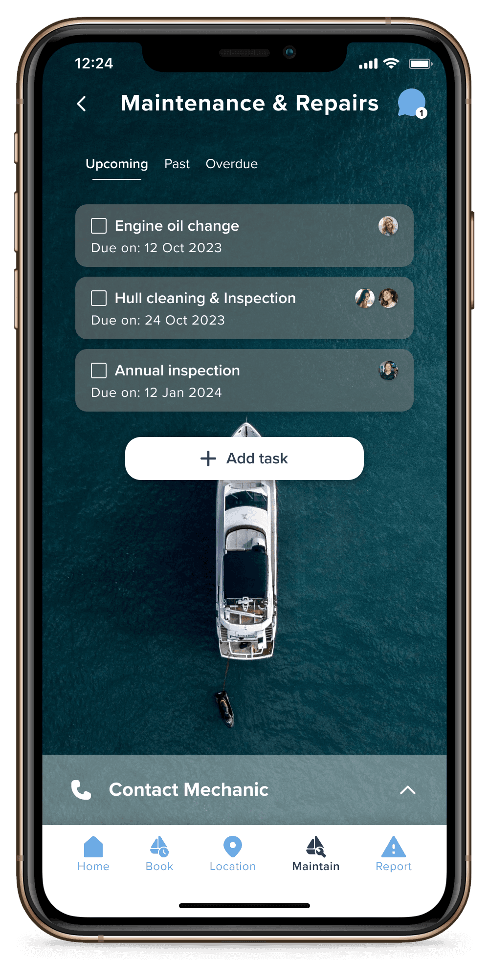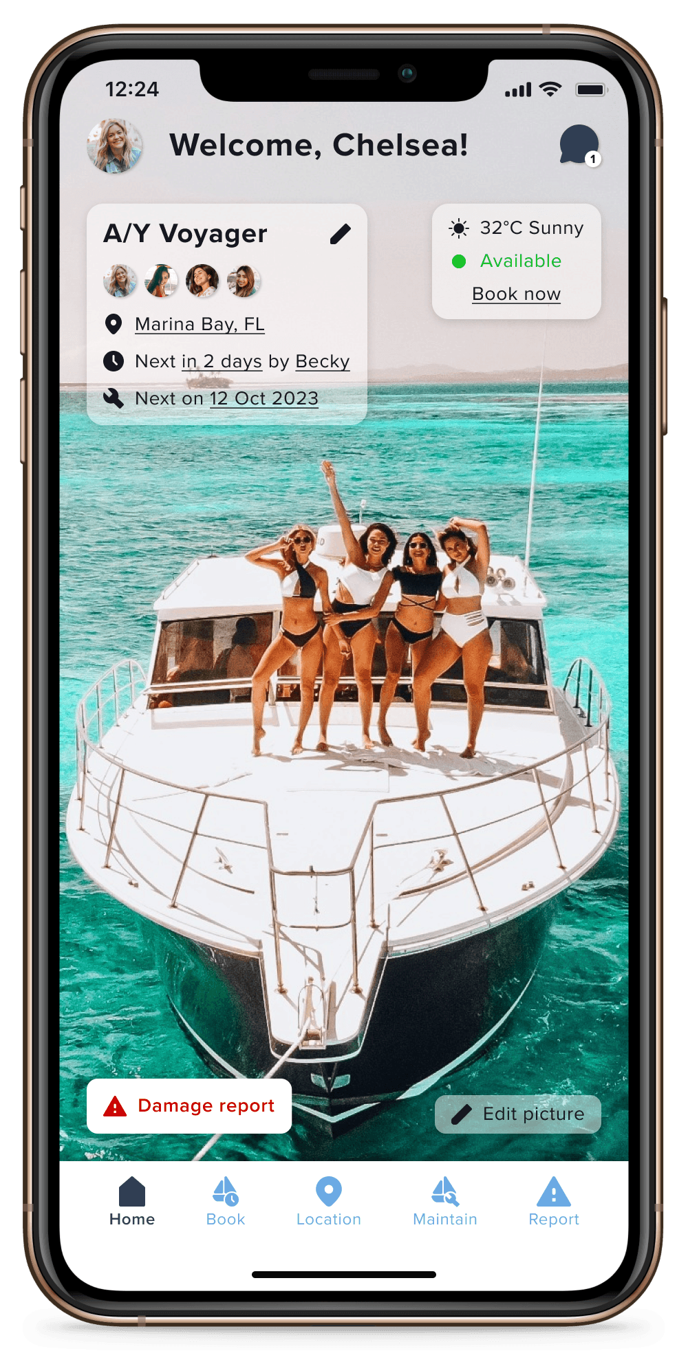 The app tells you the boat's availability right now, the local weather, the boat's location, details on the next booking and on the next maintenance task.